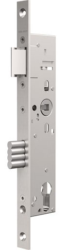 Замок для профильных дверей под евроцилиндр стандарта DIN, отпирающийся при помощи ключа, поворотной кнопки евроцилиндра или нажимной ручки.