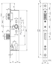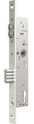 Замок для профильных дверей под евроцилиндр стандарта DIN, отпирающийся при помощи ключа, поворотной кнопки евроцилиндра или нажимной ручки.