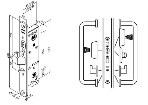 Замок для профильных входных дверей, с автоматическим запиранием ригеля, отпирающийся при помощи ключа, поворотной кнопки цилиндра или нажимных ручек.